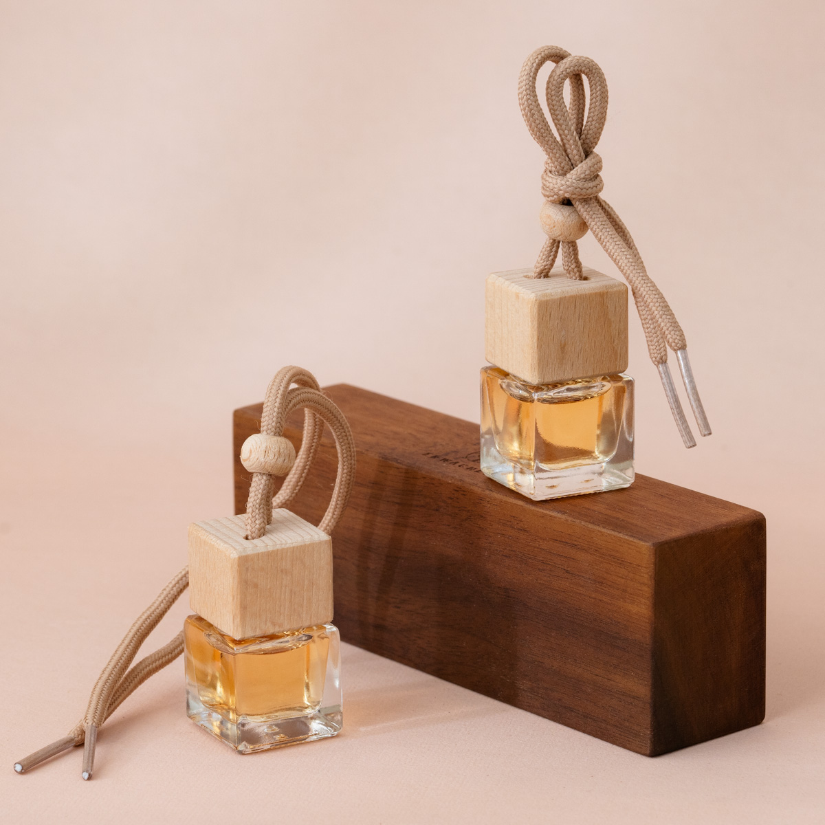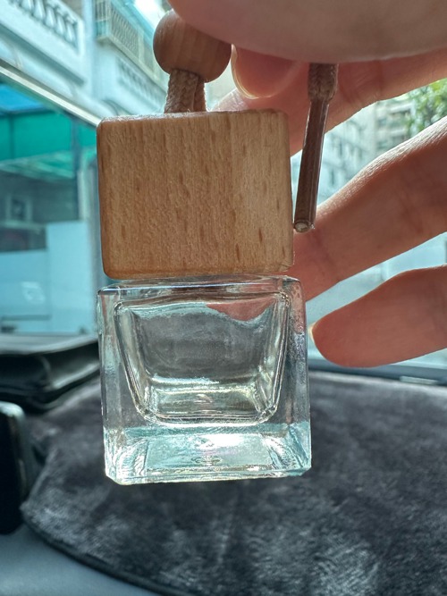先將方形玻璃罐上的塑膠軟塞打開,再將外面的木製蓋子鎖緊,將整個吊飾上下顛倒兩秒,待擴香液滲透至瓶蓋上再轉回來,即可依喜好懸掛於汽車冷氣出風口、衣櫥與其他室內小空間內。